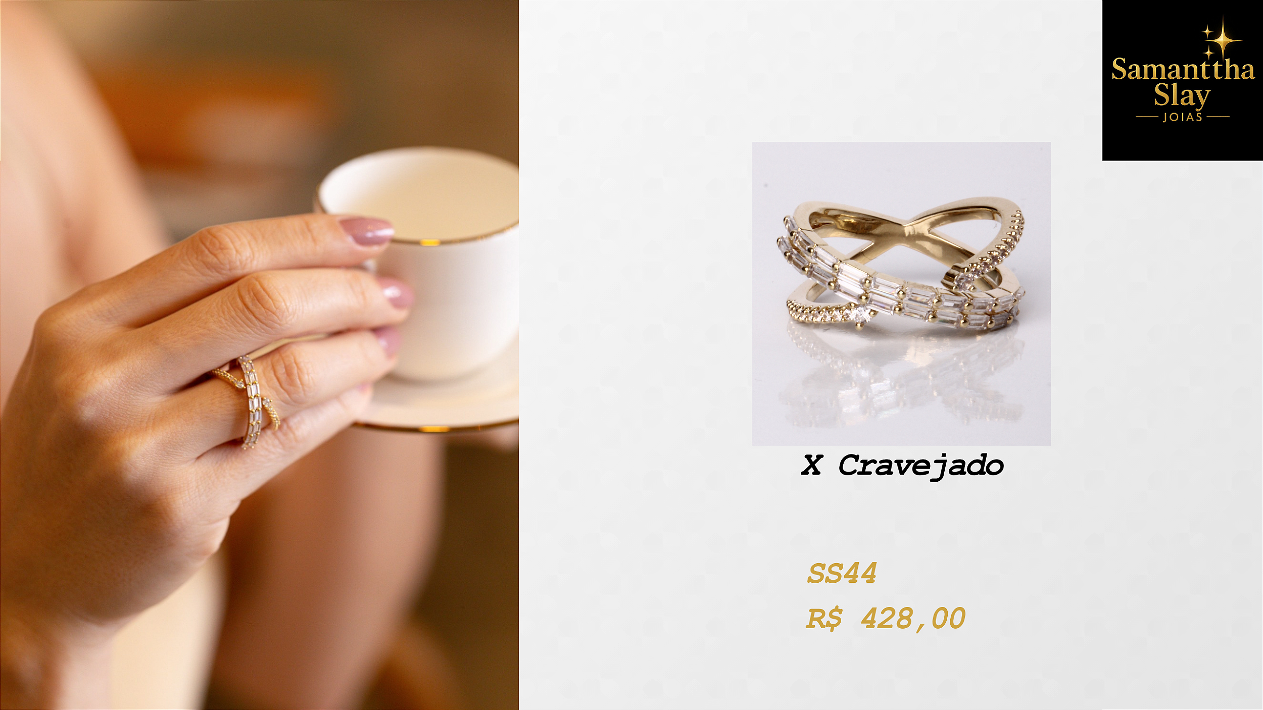 Anel Cravejado X da Samanthta Slay, uma joia com banho de ouro delicado e pedras de zircônia cravejadas que trazem elegância e brilho para seu visual. Esta peça hipoalergênica é ideal para quem busca estilo aliado ao conforto e qualidade. O anel possui design liso com zircônia no centro e nas laterais, garantindo um acabamento sofisticado para ocasiões especiais ou uso diário.